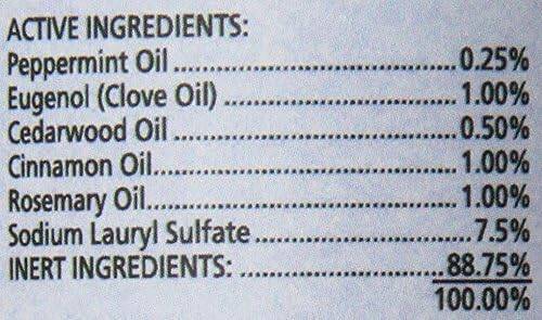Ingredients Peppermint Oil, Clove Oil, Cedarwood Oil, Cinnamon Oil, Rosemary Oil, Sodium Lauryl Sulfate