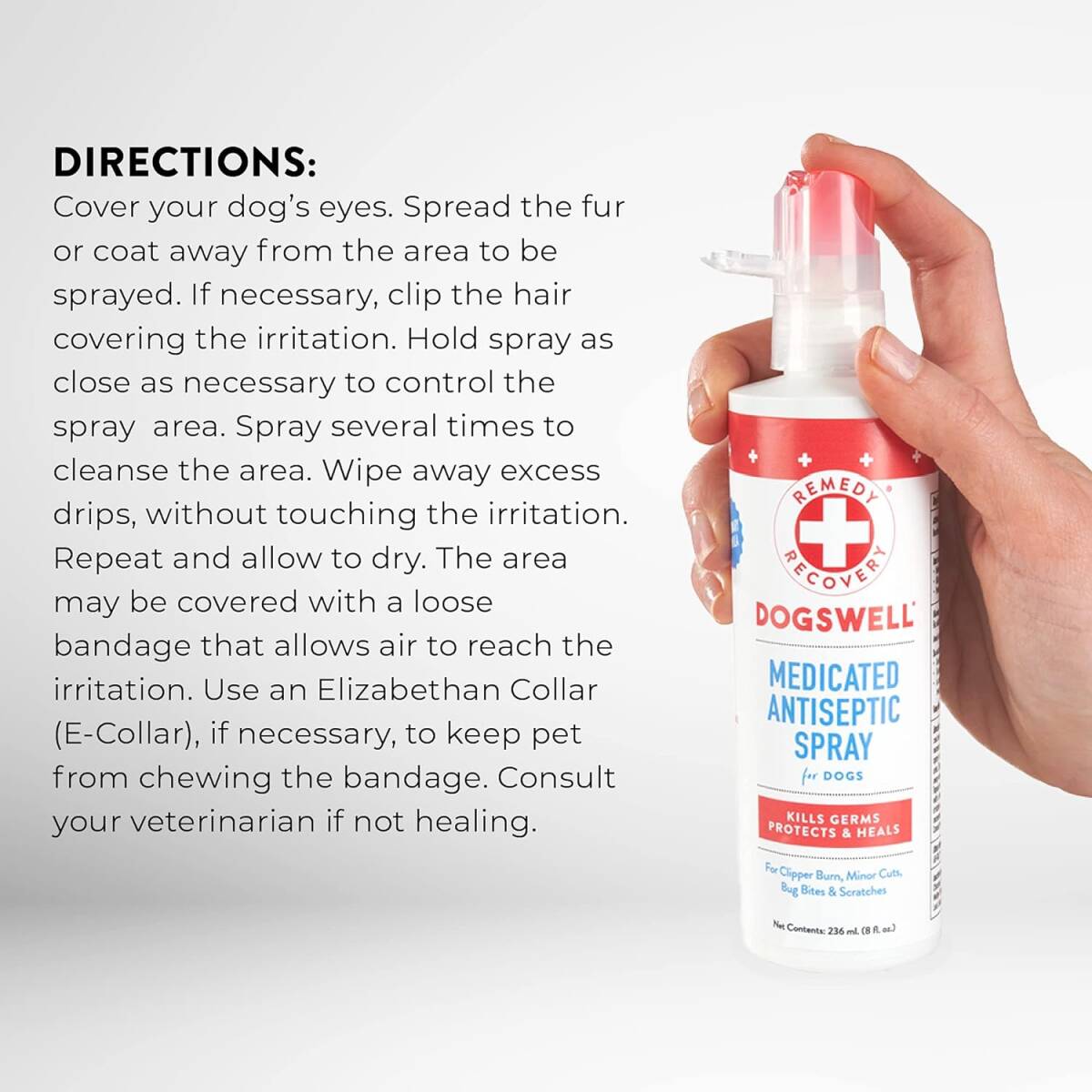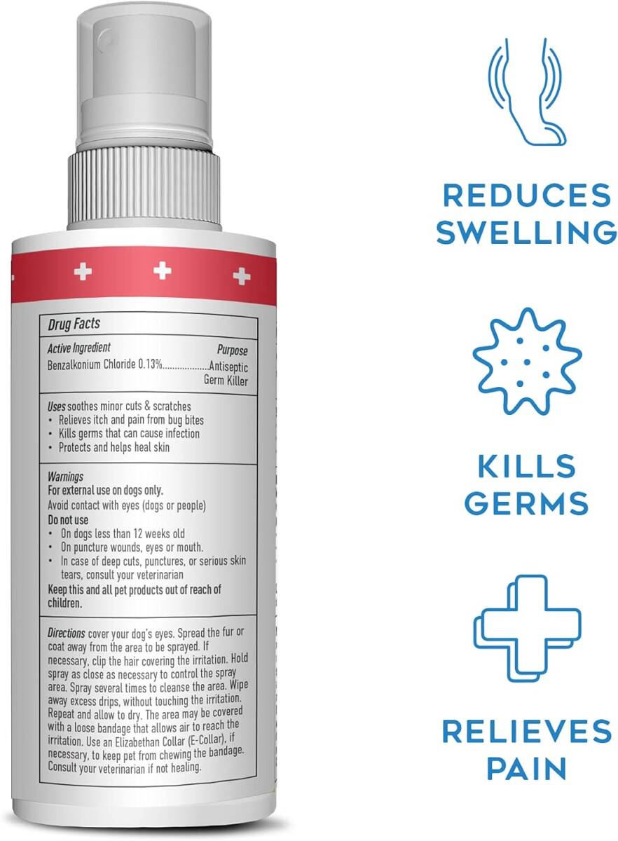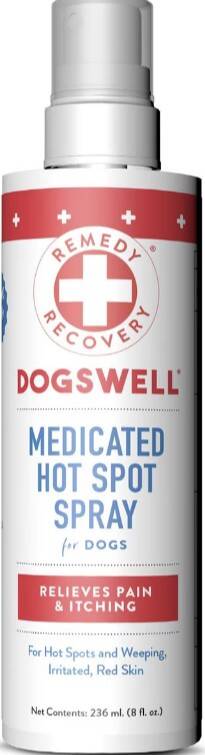 Dogswell® Remedy + Recovery® Medicated Hot Spot Spray works fast to relieve minor pain and promote healing of minor skin irritation. This easy-to-use spray gives dogs soothing, topical relief from itching caused by hot spots, flea bites, bug bites, or fly eggs and helps reduce swelling due to allergies to bites, stings and skin irritations.