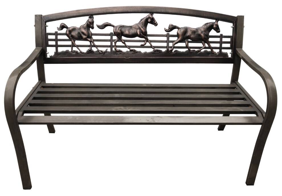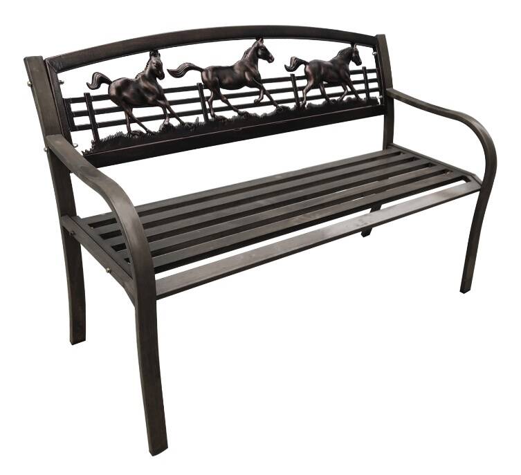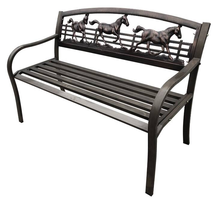 Wild horses couldn't drag you away from relaxing on this bench! Perfect for any garden path, patio or outdoor space, this bench adds a touch of Southern hospitality to any setting. It features a unique design of running horses across the back to showcase your equestrian passion.