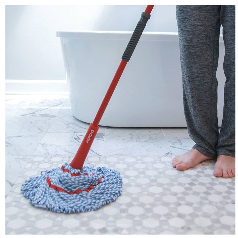Effortless mopping, one twist at a time. Designed with a built-in twist handle for controlled wringing, the O-Cedar® MicroTwist™ MAX Microfiber Twist Mop keeps your floors clean and hands dry. The extra large 18-inch mop head cleans floors quickly, with more surface area to cover more ground. Recently revamped, this mop features absorbent microfiber strings for superior spill pickup, and a buffering pad for extra cleaning power on stubborn dirt. As if that wasn’t good enough, it comes with a new, easy-to-change washable refill that still removes over 99% of bacteria with just water.*