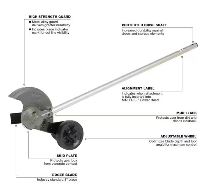 M18 FUEL™ QUIK-LOK™ Edger Attachment is powered by the M18 FUEL™ Power Head w/ QUIK-LOK™ and is compatible with our M18 FUEL™ QUIK-LOK™ Attachment System. The unit features a split shaft design and has an 8" blade and high strength guard for increased durability. The edger includes mud flaps to prevent dirt kickback as well as a skid plate to protect the gearbox from concrete contact. The adjustable wheel allows you to set optimized blade depth and tool angle for maximum control. The QUIK-LOK™ Attachments feature protected drive shafts for increased durability against drops and storage elements. The split boom edger attachment also utilizes optimized gearing to manage the cordless M18 FUEL™ Power Head RPM output specifically for edging applications.