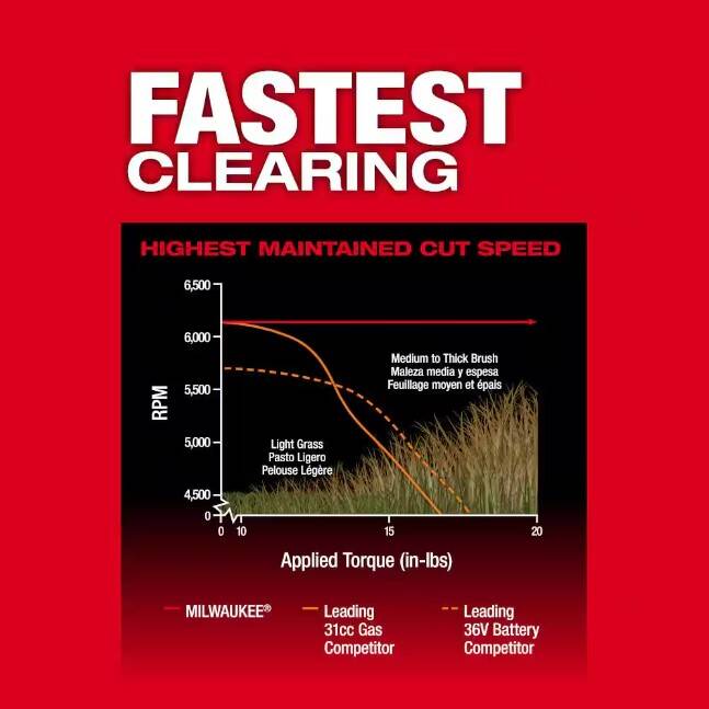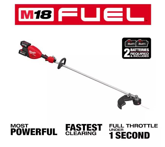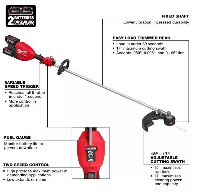 M18 FUEL™ 17" Dual Battery String Trimmer meets the performance, durability, and ergonomic needs of landscape maintenance professionals. Our string trimmer provides the Highest Power, delivering the most peak torque compared to leading professional gas and battery string trimmers. This string trimmer provides users with the Fastest Clearing, cutting through the most demanding applications while maintaining the highest string speed. The POWERSTATE™ Brushless Motor and advanced electronic package allow the string trimmer to reach Full Throttle in Under 1 Second, boosting control and productivity. The REDLINK PLUS™ Intelligence enables full-circle communication between the tool and battery, providing you with unmatched levels of performance, protection, and productivity. The advanced electronic package also delivers high and low speeds, and a variable speed trigger giving you ultimate control over the power range. The string trimmer requires (2) M18™ REDLITHIUM™ Batteries for operation and is optimized to be used with M18™ REDLITHIUM™ HIGH OUTPUT™ batteries. The M18™ REDLITHIUM™ HIGH OUTPUT™ XC8.0 Battery gives you best-in-class performance and run-time in all applications. The Easy Load Trimmer Head provides an easy line loading experience and the ability to load up to 25' of trimmer line in under 30 seconds. The M18 FUEL™ 17" Dual Battery String Trimmer is fully compatible with 250+ solutions on the M18™ system.