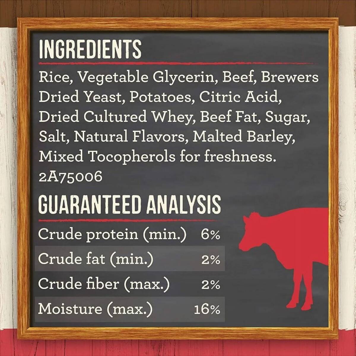 | Ingredients | Rice, Vegetable Glycerin, Beef, Brewers Dried Yeast, Potatoes, Citric Acid, Dried Cultured Whey, Beef Fat, Sugar, Salt, Natural Flavors, Malted Barley, Mixed Tocopherols for freshness. |