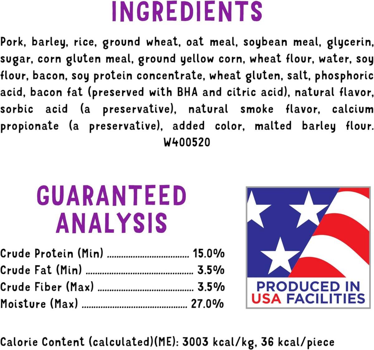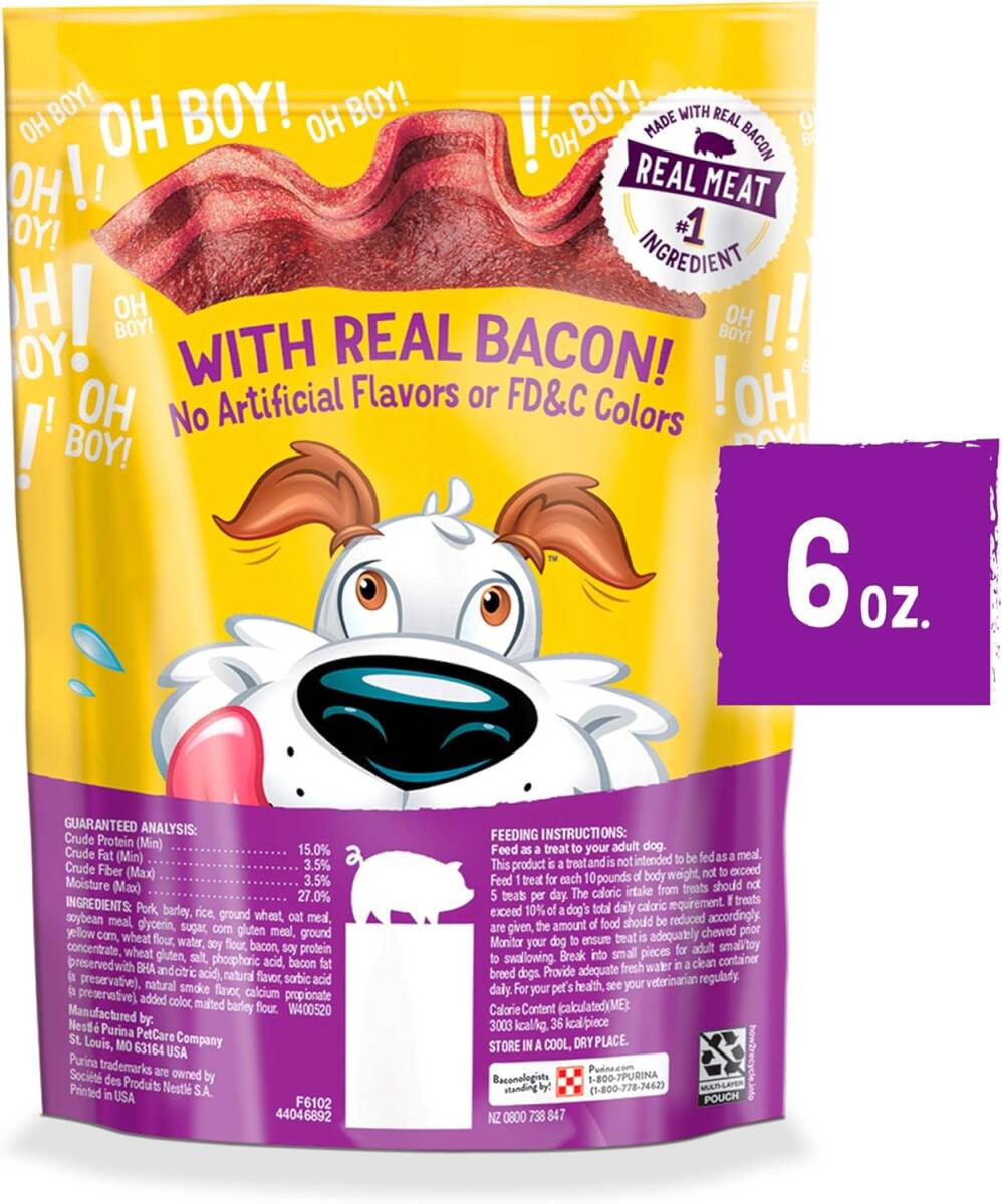 | Ingredients | Pork, barley, oat meal, brewers rice, soybean meal, ground whole wheat, glycerin, sugar, corn gluten meal, wheat flour, wheat gluten, water, ground yellow corn, bacon, soy protein concentrate, salt, phosphoric acid, natural flavor, sorbic acid (a preservative), bacon fat (preserved with BHA and citric acid), natural smoke flavor, calcium propionate (a preservative), Red 40, Yellow 5, Blue 1, Yellow 6 |