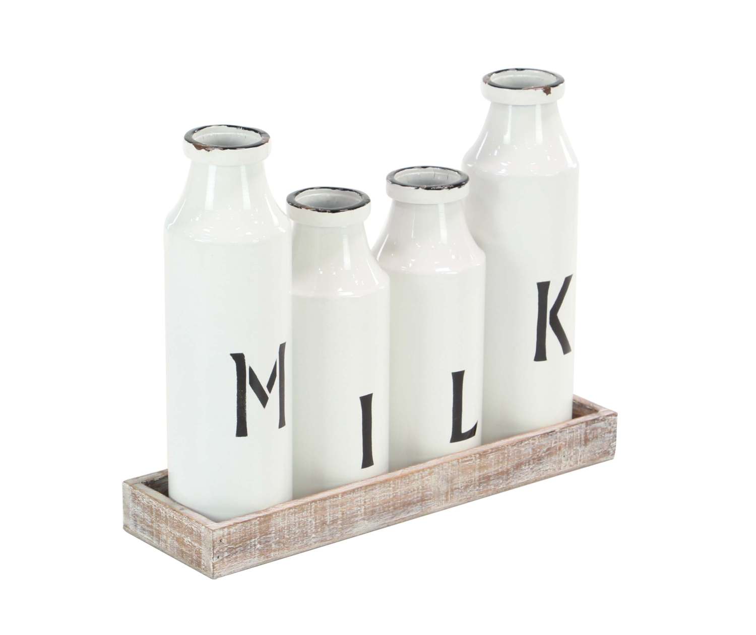 • Four white bottles in different sizes forming the -inchmilk-inch word, brown finish on rectangular tray