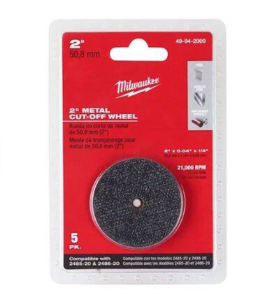 Our 2" Metal Cut Off Wheel is a 5-pack of 2 in. x 0.040 in. x 1/4 in. cut-off wheels. Rated for a maximum of 21,000 RPM this wheel is an ideal solution for cutting stainless and other metals quickly and efficiently. Milwaukee's comprehensive offering of grinding and cutting wheels consists of 45 unique products ranging in diameters from 3 in. to 14 in. with arbor configurations of 3/8 in., 7/8 in., 20 mm and 5/8 in. Milwaukee's abrasive offering provides products ranging from general-purpose to specialized high-performance applications.