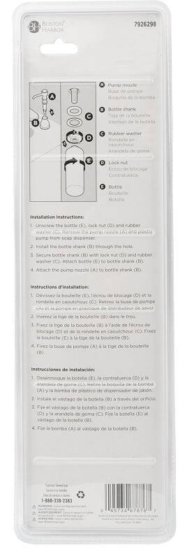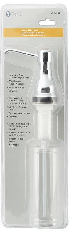Refill from the top by removing soap dispenser pump head and pour in soap from the top. Soap bottle holds 11 oz of liquid dish soap, hand soap, liquid detergent or hand lotion. Press to dispense liquid. Clear plastic bottle. Chrome finish.