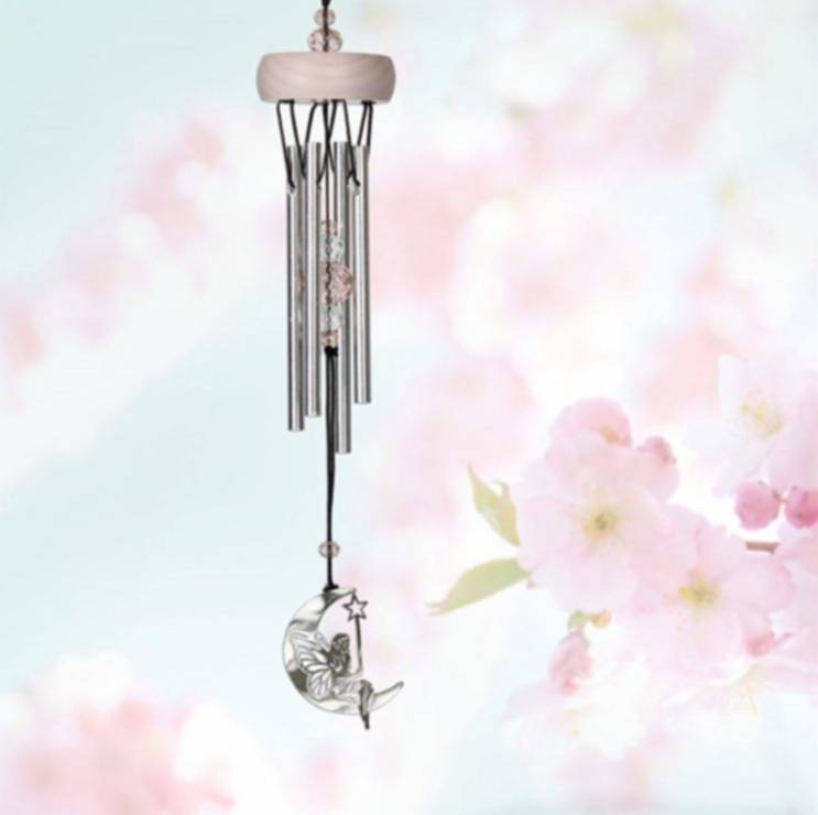 Delicate chiming combines with sparkling crystals and motifs from nature and mythology to enchant and delight. A silver fairy on a crescent moon acts as the windcatcher (or, if you will, dreamcatcher) of this chime. Pink and clear faceted crystals embellish the chime, symbolizing the free spirit of these magical beings.