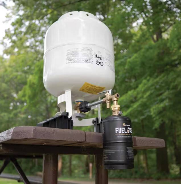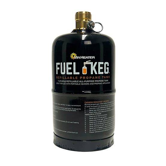 1-Pound Empty Fuel Keg Refillable Propane Cylinder Works With Mr. Heater Kit F200049. This product is a a refillable 1lb propane tank that combines the benefits of saving money, conservation, and ease of use.