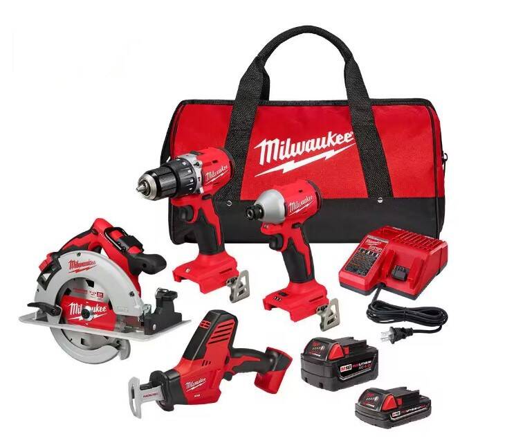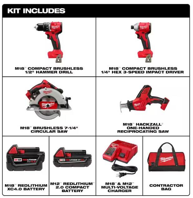 M18™ 4-Tool Combo Kit includes the M18™ Compact Brushless 1/2" Hammer Drill, M18™ Compact Brushless 1/4" Hex 3-Speed Impact Driver, M18™ Brushless 7-1/4" Circular Saw, and M18™ Hackzall. The Compact Hammer Drill is 5.8" in length and lightweight at 2.3 lbs without a battery allowing for excellent control, especially while working in overhead or tight spaces. The cordless 3-Speed Impact Driver measures only 4.4" in length and 2.1" wide, allowing for better access in tight spaces while being lightweight and portable. The Brushless 7-1/4" Circular Saw delivers up to 40% more power than circular saws with brushed motors while giving you up to 30% more run-time. The M18™ Hackzall gives you 0-3,000 strokes per minute while its 3/4” stroke length allows you to perform fast cuts through a wide range of material such as wood, metal, and PVC. The REDLINK™ Intelligence optimizes how our M18™ REDLITHIUM™ batteries work with the tools for best-in-class performance. This kit includes (1) M18™ REDLITHIUM™ XC4.0 Battery Pack, (1) M18™ REDLITHIUM™ CP2.0 Battery Pack, M18™ and M12™ Multi-Volt Charger and Contractor Bag. The M18™ 4-Tool Combo Kit is part of the M18™ system, fully compatible with over 250+ solutions.