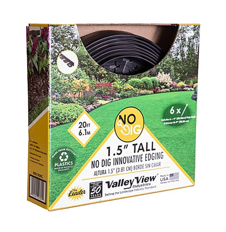 Valley View® Innovative Edge 20ft L x 1.5in H - No digging required, no bead and installs quickly and easily. Flexible and durable and makes straight or curved edges. Includes six poly stakes.