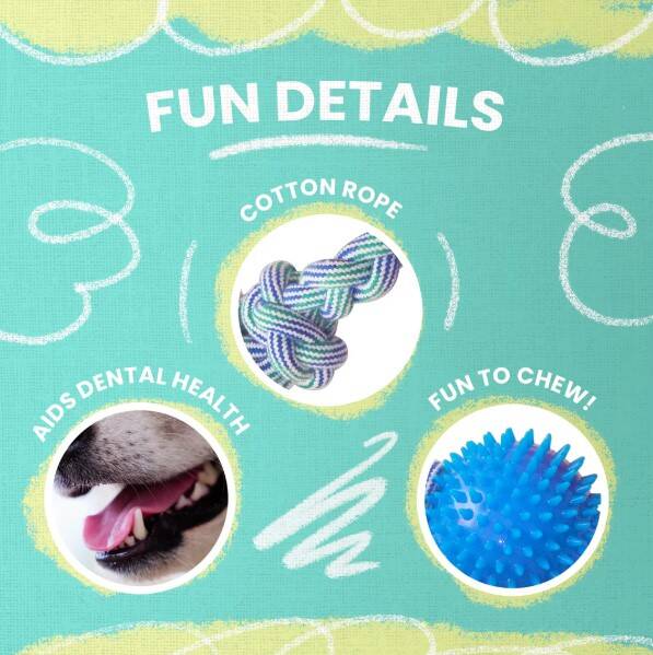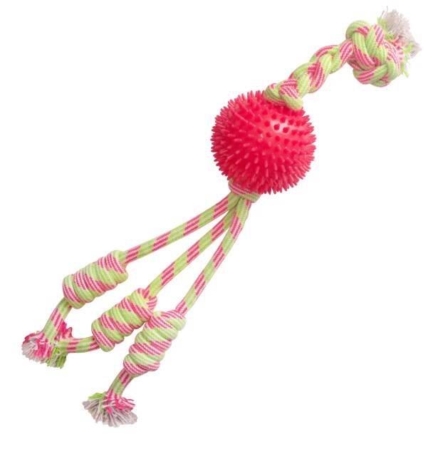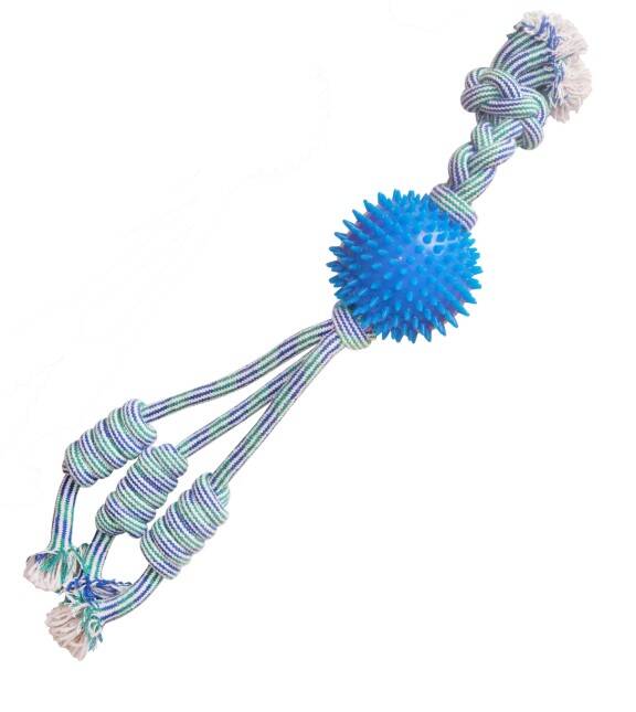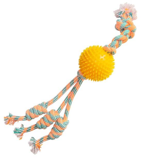 - Features three knotted strands leading into a central, larger Thermoplastic Rubber (TPR) ball, offering a variety of textures for your dog to explore.