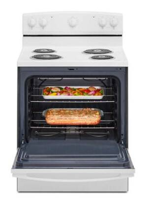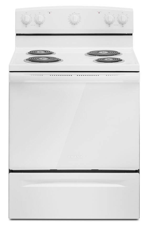 This Amana® electric range makes delicious meals, without difficult clean-up. Splatters won't matter with the Easy-Clean Glass Door that helps messes wipe away easily. The versatile cooktop features the SpillSaver UpSwept™ Cooktop, so you can go ahead and spill the beans, and the large oven capacity means there is room for dinner and dessert to cook at the same time.