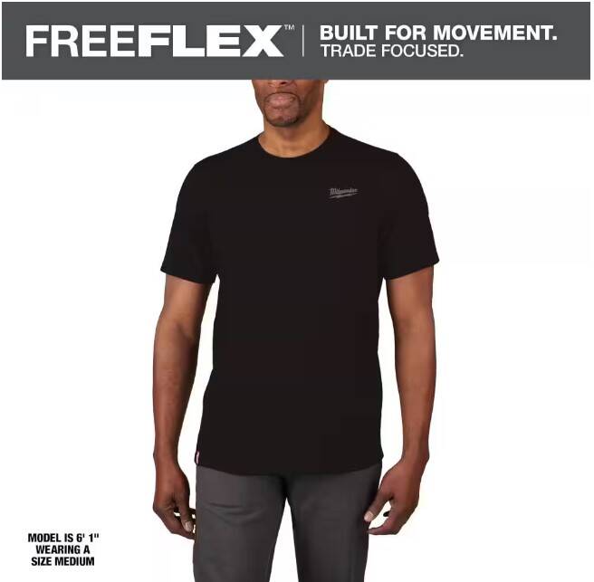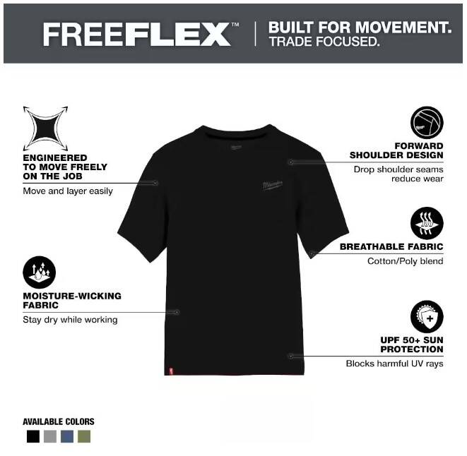 Part of the MILWAUKEE® FREEFLEX™ Collection, our Short Sleeve Hybrid Work Tee is BUILT FOR MOVEMENT. Milwaukee Short Sleeve Hybrid Work Tee is a lightweight and breathable solution that allows you to STAY COMFORTABLE and KEEP COOL. This work t-shirt is specifically created for mobility and durability with its drop shoulder design to reduce wear on the seams. The MILWAUKEE® Hybrid Work Tee Shirts are built to protect against the elements, offering UPF 50 protection for those warm days on the jobsite and moisture-wicking fabric so you can stay dry while working. Choose from a variety of colors, including black, blue, gray, and green, available in sizes small to 3XL.