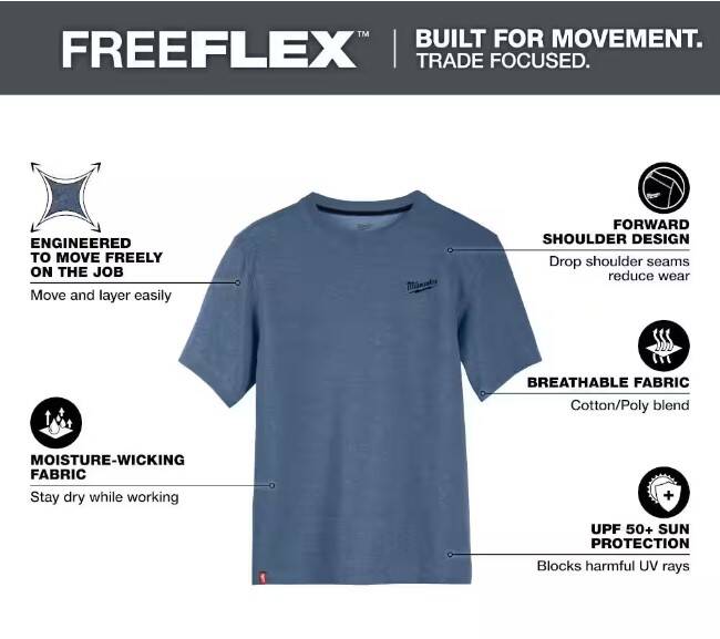 Part of the MILWAUKEE® FREEFLEX™ Collection, our Short Sleeve Hybrid Work Tee is BUILT FOR MOVEMENT. Milwaukee Short Sleeve Hybrid Work Tee is a lightweight and breathable solution that allows you to STAY COMFORTABLE and KEEP COOL. This work t-shirt is specifically created for mobility and durability with its drop shoulder design to reduce wear on the seams. The MILWAUKEE® Hybrid Work Tee Shirts are built to protect against the elements, offering UPF 50 protection for those warm days on the jobsite and moisture-wicking fabric so you can stay dry while working. Choose from a variety of colors, including black, blue, gray, and green, available in sizes small to 3XL.