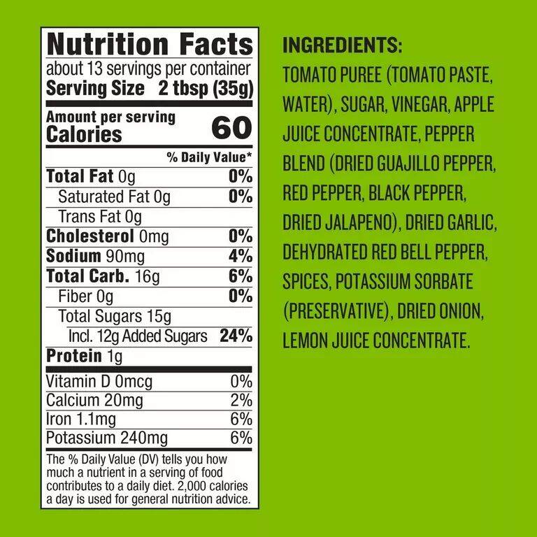 | Ingredients | Tomato Puree (Tomato Paste, Water), Sugar, Vinegar, Apple Juice Concentrate, Pepper Blend (Dried Guajillo Pepper, Red Pepper, Black Pepper, Dried Jalapeno), Dried Garlic, Dehydrated Red Bell Pepper, Spices, Potassium Sorbate (Preservative), Dried Onion, Lemon Juice Concentrate |