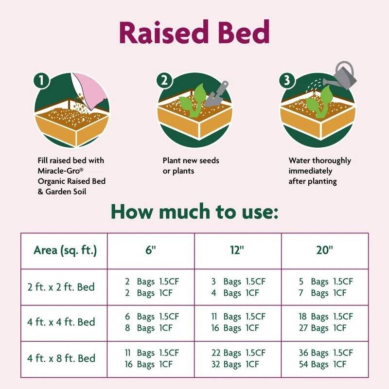 Successful Organic Gardening Made Attainable™. Miracle-Gro® Organic Raised Bed & Garden Soil is a soil blend with quick release natural fertilizer that grows more vegetables guaranteed (vs. unfed plants; satisfaction guaranteed or your money back). This organic soil blend is peat free, formulated with upcycled green waste, and feeds plants for up to 2 months. In addition, it is locally crafted (meaning the product is manufactured less than 150 miles on average from the stores in which it is sold, excluding AK and HI). Miracle-Gro® Organic Raised Bed & Garden Soil is perfect for raised bed and in-ground gardening. When planting in a raised bed, fill with Miracle-Gro® Organic Raised Bed & Garden Soil then plant new seeds or plants. When planting in ground, thoroughly mix in 3 inches of Miracle-Gro® Organic Raised Bed & Garden Soil for every 6 inches of native soil then plant new seeds or plants. Always water thoroughly immediately after planting, whether in a raised bed or in-ground. It is important to check soil for moisture levels. Let the mix dry to the touch between waterings. Do not allow plants to sit in drainage water. Outdoor plants may require daily watering in hot weather.