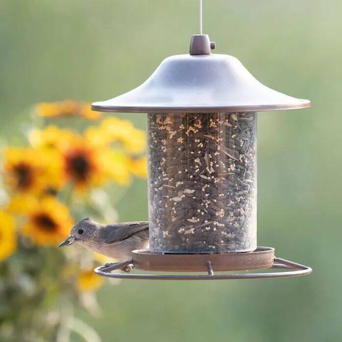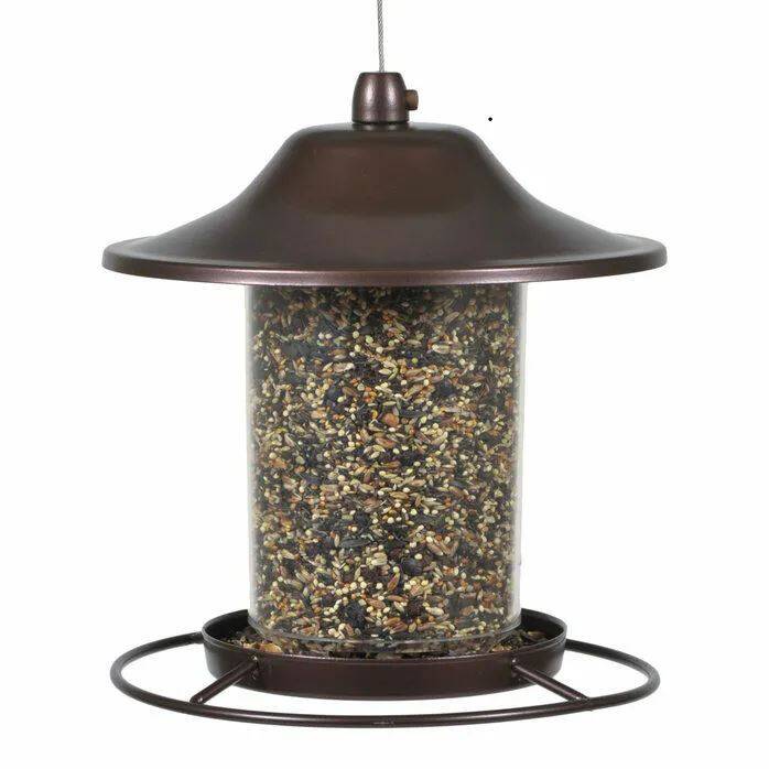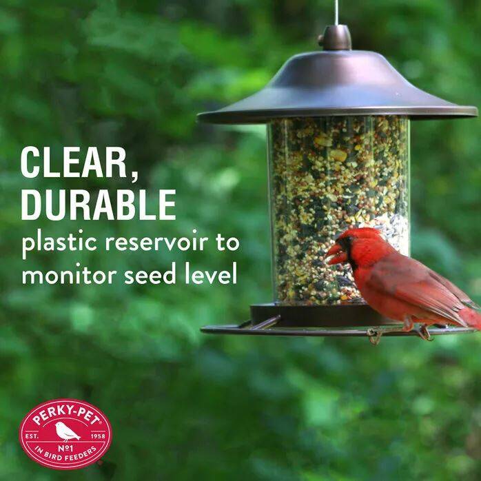 The Perky-Pet® Bronze Panorama Bird Feeder is sure to attract many birds to your backyard, including cardinals, titmice, nuthatches and more. The innovative design of this feeder allows the seed to dispense into the tray and stops dispensing once the tray is full. Simply fill with sunflower seed, mixed seed, or any other kind of bird seed. Then, as the birds dine from the circular perch, the seed is replenished into the tray so it remains consistently full.
