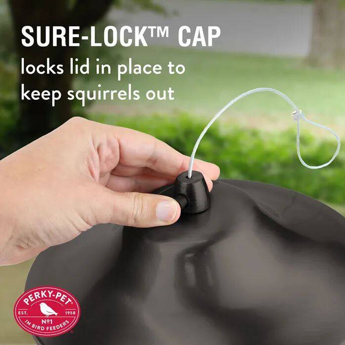 - Sure-Lock™ Cap Locks Lid In Place To Keep Squirrels Out