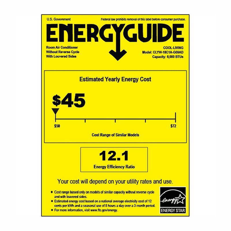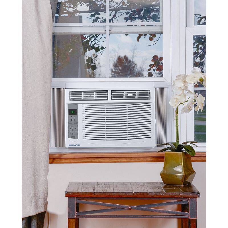 Keep cool with this powerful high-efficiency Cool-Living 6,000 BTU 115-Volt Window Air Conditioner. This Energy Star rated air conditioner is high-powered, yet easy on electricity bills. It features a digital thermostat, remote control and multiple cooling and fan modes. The oscillating fan moves lots of cool air around the whole room. This air conditioner with digital display is easy to use and saves your preferred settings even when the power goes out. The programmable 24-hour timer allows you to set the unit to come on or turn off even when no one is home. The window air conditioner with remote can be adjusted from anywhere in the room for added convenience. A window installation kit is included for vertical-opening windows, making the air conditioner simple and quick to install.