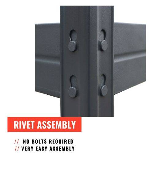 • This shelving unit features a boltless rivet system, an innovative dowel pin or metal rivet, for an easy installation, adding strength and stability.