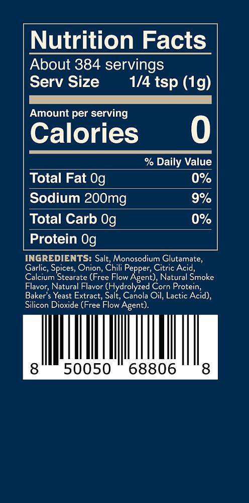 Ingredients Salt, Monosodium Glutamate, Garlic, Spices, Onion, Chili Pepper, Citric Acid, Calcium Stearate (Free Flow Agent), Natural Smoke Flavor, Natural Flavor (Hydrolyzed Corn Protein, Baker’s Yeast Extract, Salt, Canola Oil, Lactic Acid, Silicon Dioxide (Free Flow Agent).