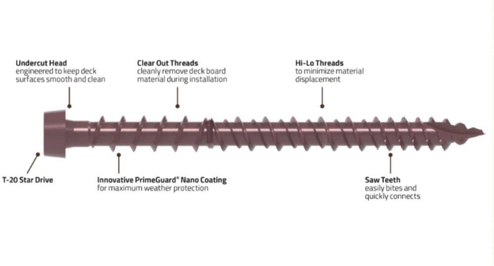 Get a smooth PVC or composite deck effortlessly with DeckForce® exterior composite screws. Enhanced by PrimeGuard® Nano coating for maximum weather resistance, these screws ensure durability. The undercut head prevents bulging, providing a seamless finish. The sharp T-17 saw tip ensures quick connections. Backed by a limited lifetime warranty, DeckForce® exterior composite screws provide you with peace of mind.