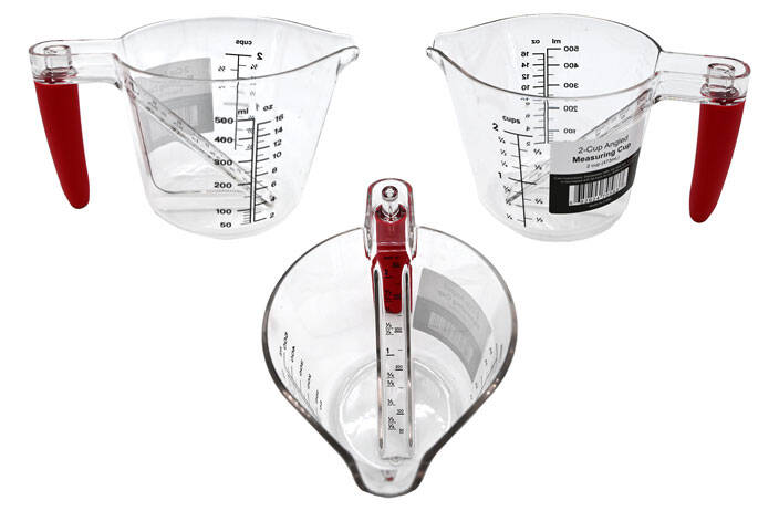 Angled measuring cups, 2 cup capacity with angled markers to allow measuring from above.