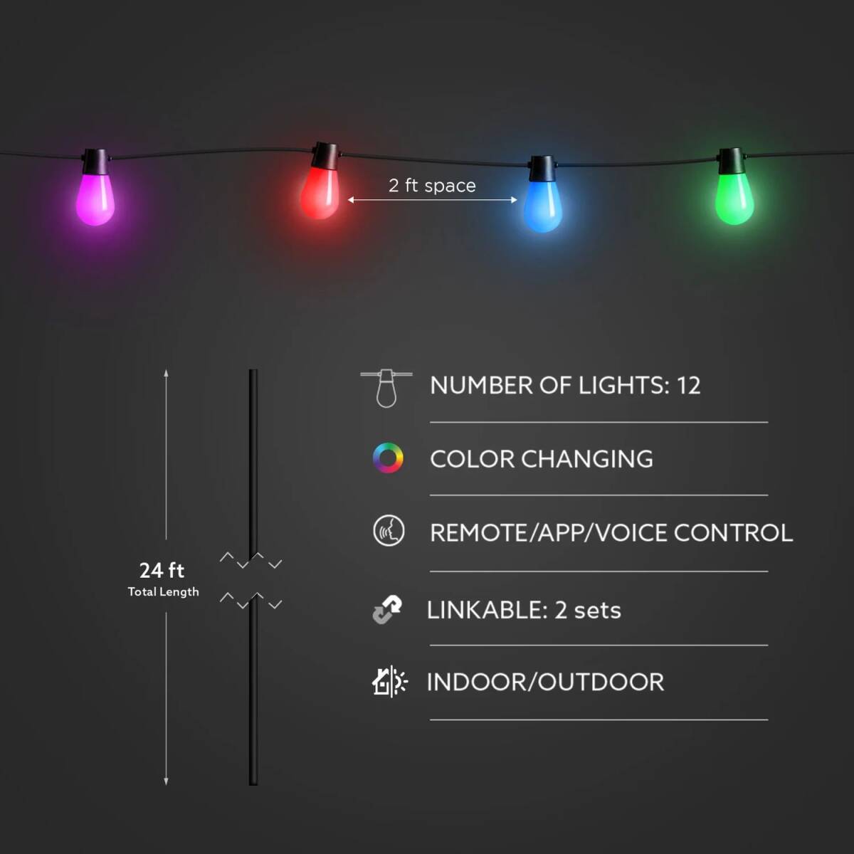 Each 24-foot string of lights includes 12 shatter-resistant LED bulbs and two spares. Smart setup is simple: connect to your Wi-Fi using a 2.4GHz network in minutes. Wet location rated, LVSL24-12/RGBW/AG string lights use a heavy-duty black 18/5 cord. Transform your outdoor space with lighting that withstands tough weather for year-round enjoyment.