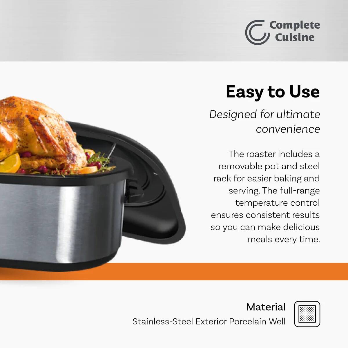 - The Complete Cuisine 16-quart roaster oven has full-range temperature control, a removable steel rack and porcelain well, a stainless-steel exterior, and cool-touch handles