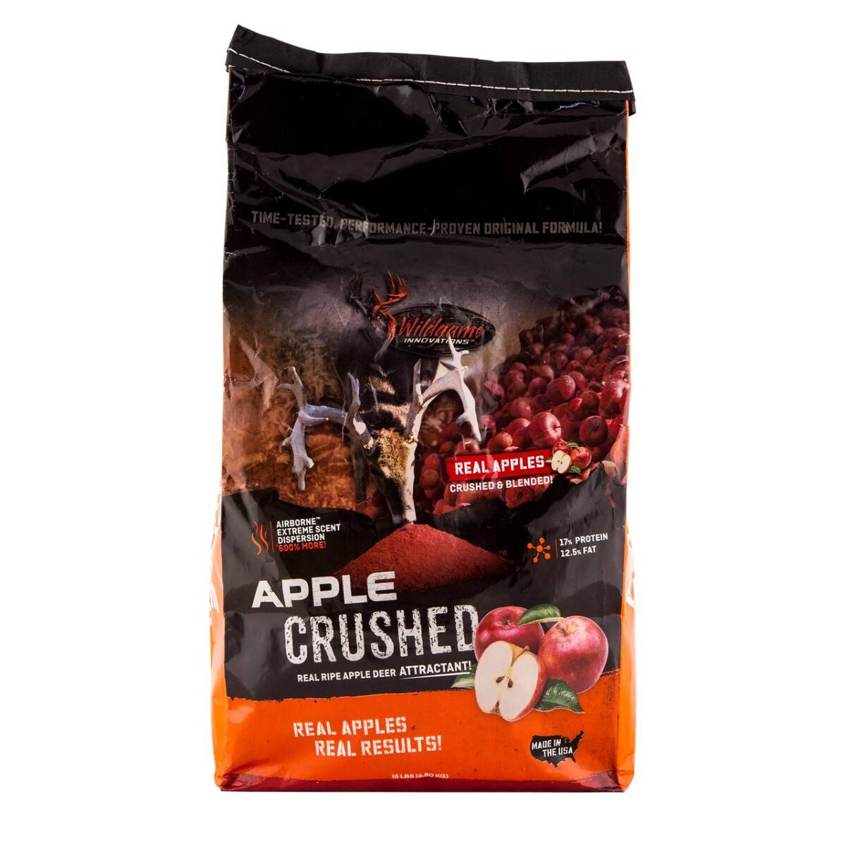 Deer go wild for the sweet aroma and delicious taste of ripe, juicy apples, and now Wildgame Innovations is bringing the orchard to you with Apple Crushed. We take fresh, all-natural ripe apples then crush ’em with a blend of nutrient-filled proteins and fats. The end result is an irresistible deer feed that will grow monster trophy bucks. Airborne Technology distributes 600% more scent molecules than ordinary feed grains to attract deer with an apple scent over crazy long distances at super-sonic speeds. Unleash a whole bushel of attractant power with Apple Crushed attractant.