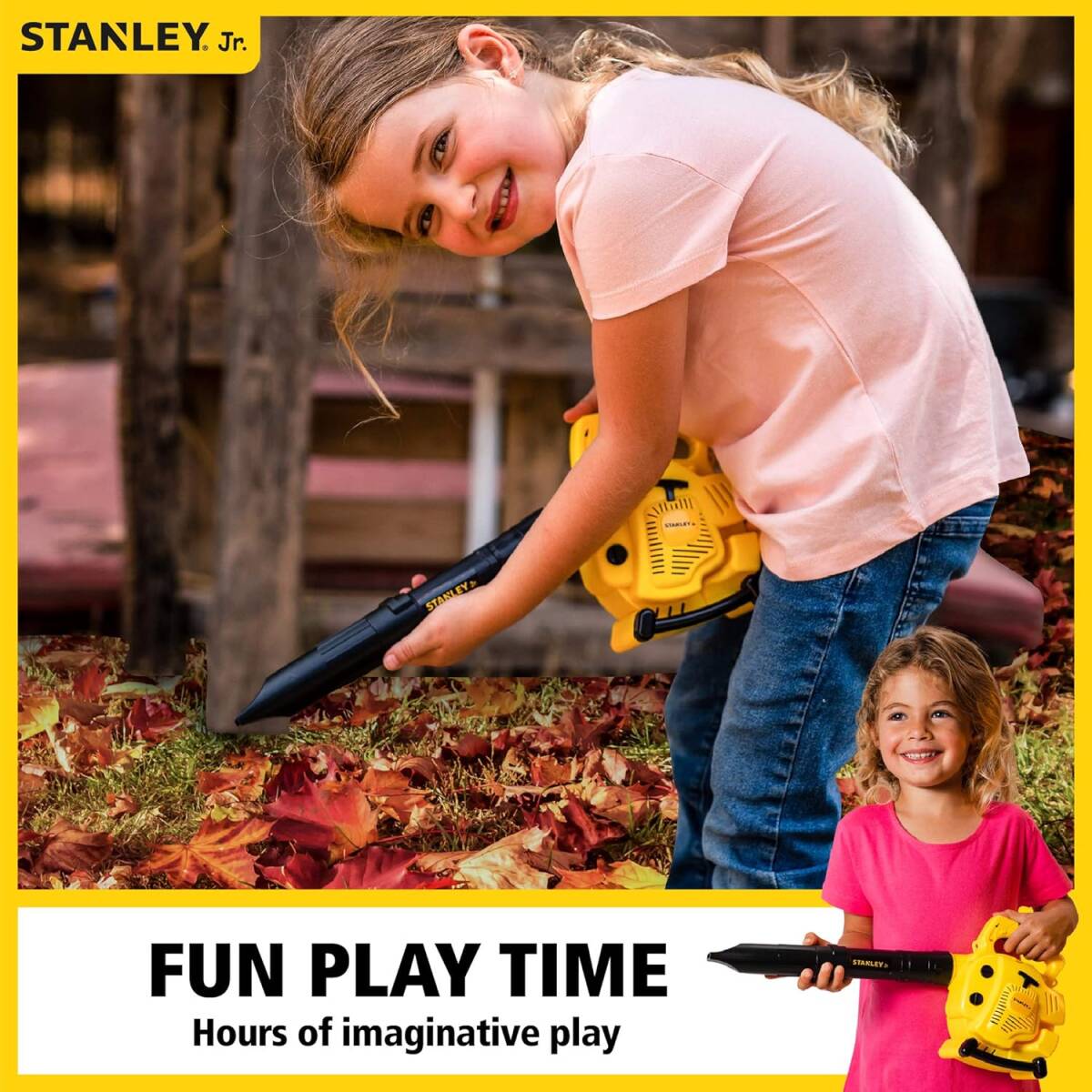 Pretend Play Tools open a new world of play for your kids. Our Stanley Jr Leaf Blower allows your kid to help out with yard work, this toy actually blows out air and makes realistic sounds and lights to make the experience as real as possible.