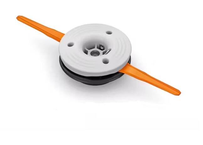 This is a multi-purpose cutting tool with three thermoplastic blades that are ideal for hard-to-reach places and large areas of high-growing grass. The blades are mounted on bushings and extend when the engine is brought up to operating speed. The white thermoplastic blades are also ideal for trimming around monuments and other solid objects as they don’t mark the stone. The blades are easy to change and some models can also be fitted with flexible nylon line in addition to or in place of the blades.