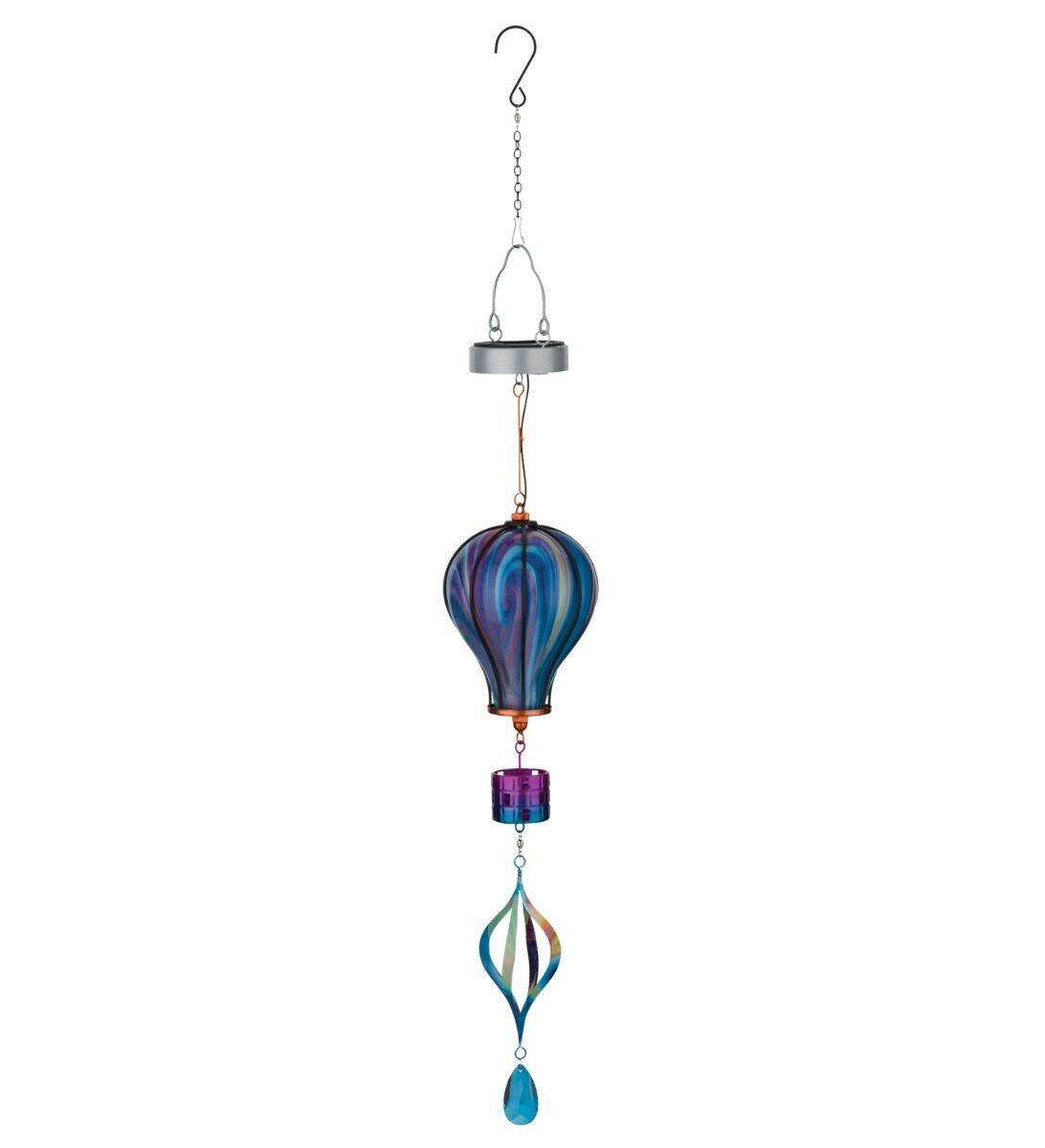 Hand blown glass Hot Air Balloons with a unique colorful swirl pattern that makes these Solar Lanterns stand out. During the day they are beautiful glass sculptures that catch the sunlight. At night the colorful glass lights up from a solar powered LED light inside, and appear to be floating in the sky. Additionally, there is a matching spinner and glass ornament on the bottom.