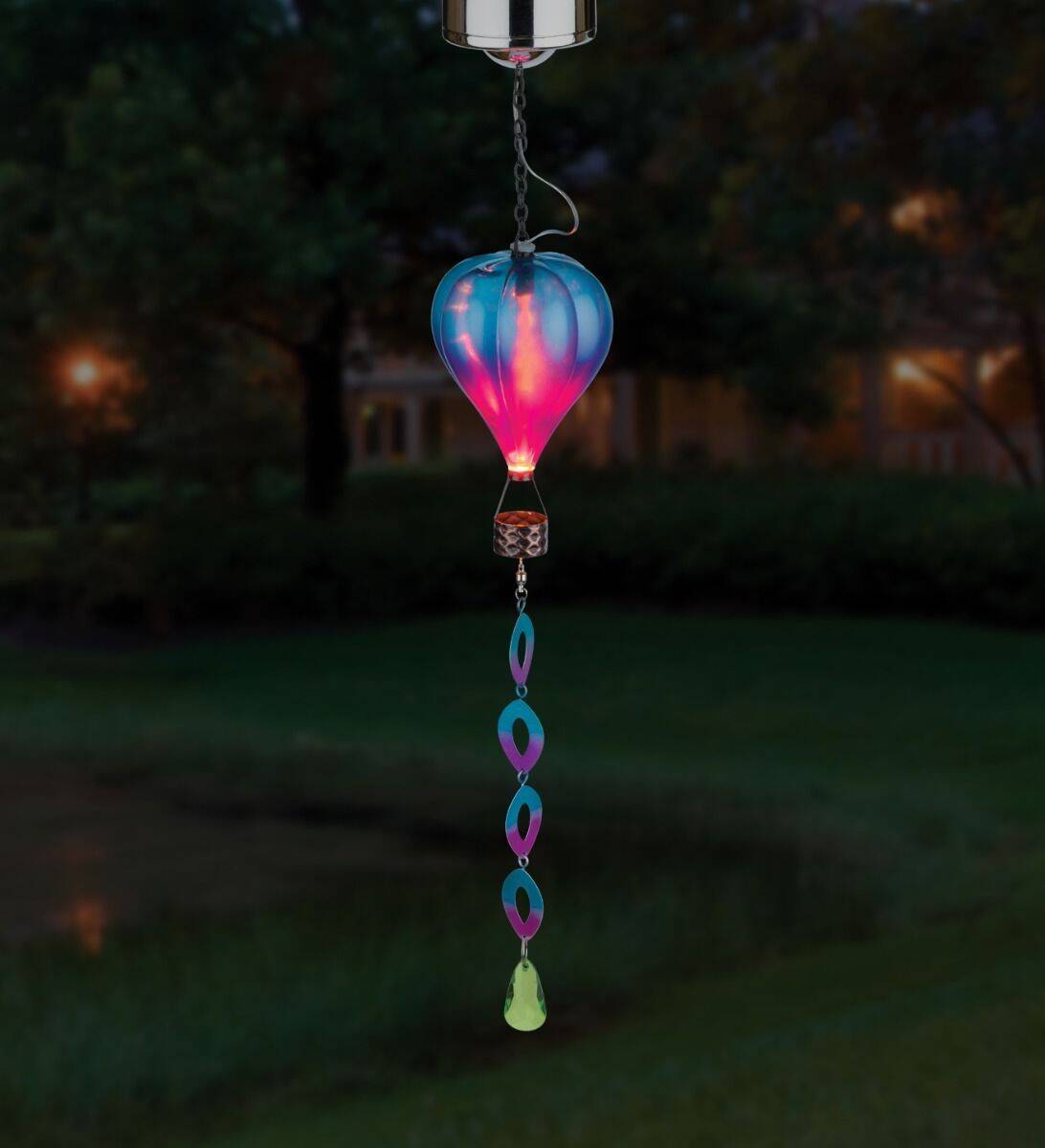 Solar Hot Air Balloon Lantern with LED lights that glow like a flame rising up from the burner engine into the balloon. Fascinating to watch! Made of durable Acrylic and comes with a decorative spinning metal tail and weighted gem on the bottom.