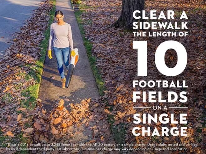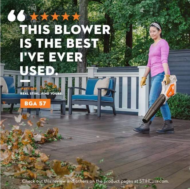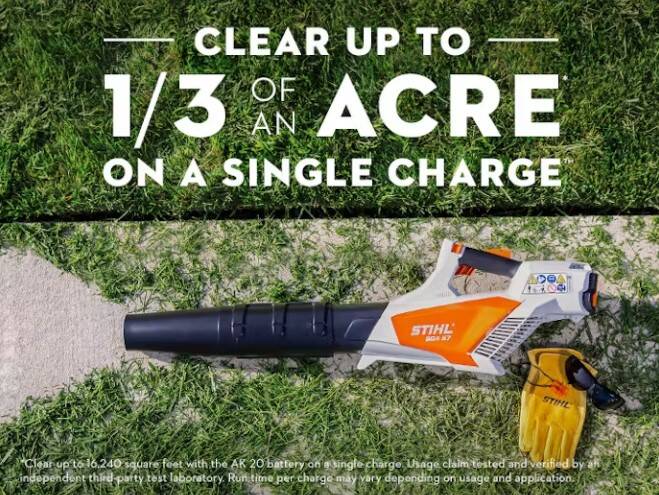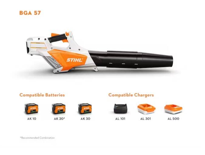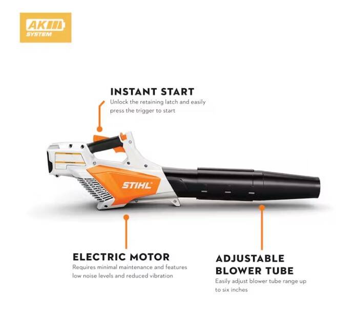 The BGA 57 delivers powerful STIHL performance combined with great control and comfortable operation. This blower has up to 123 mph of maximum air velocity for effective clearing of leaves and other yard debris. Weighing just over five pounds, the BGA 57 is compact and portable. A slim design and even weight distribution allow the blower to be held close to the body, keeping fatigue to a minimum while maximizing maneuverability. Additional comfort features include a symmetrical trigger lockout that allows for easy start of the unit with either the left or right hand, a rubberized handle for comfortable grip, and a tube that easily adjusts to three lengths to suit different heights. The BGA 57 has a run time of up to 25 minutes On A Single Charge™* with the AK 20 battery, making it the ideal choice for homeowners to care for their yard, deck, sidewalks, driveway, and more.