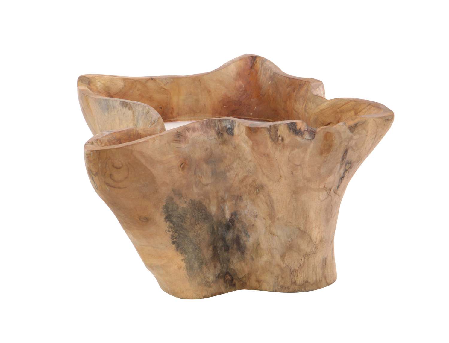 • An irregularly shaped teak pot in brown finish with curved edges, and a white candle inside
