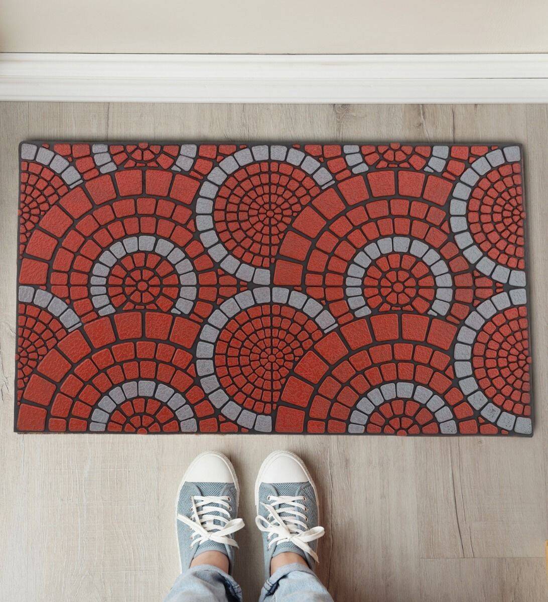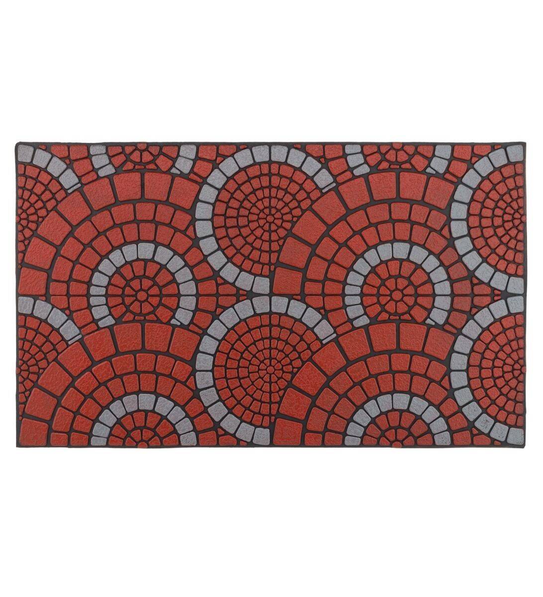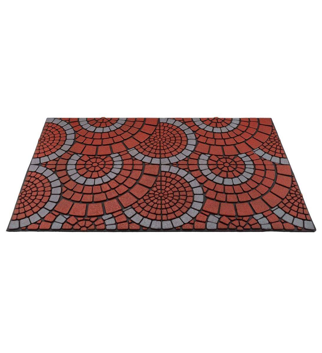 A thick rubber mat in unique designs for a richer look, more comfortable step and a longer life. Regal Doormats feature superior style with everyday function. A collage of circles in brick red and gray tones with embossed mosaic raised squares. A delightful geometric design in a decorative mat that is easy to clean.