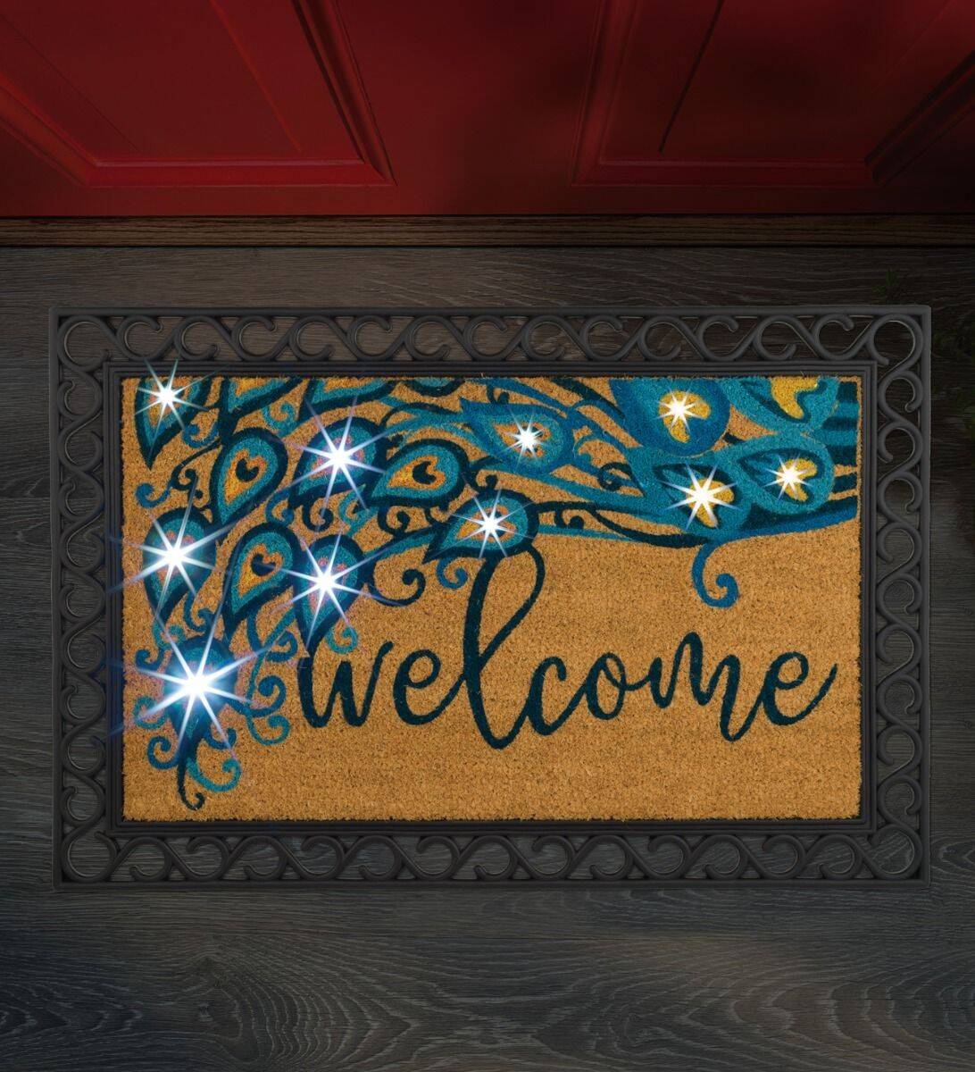 Introducing an ingenious combination of technology and art. An artistic rendering of a peacock tail surrounding a warm 'Welcome' greeting. When stepped on, the feathers in the peacock's tail light up from the many small LED lights embedded in the Coir mat, illuminating the scene and the entryway. This full size 24" x 36" doormat is made of all natural coconut husk (Coir) surrounded by a durable decorative rubber border frame and is backed with a non-slip rubber backing to keep it in place. It will nicely decorate the area in front of an entry door and entertain your guests as they step up to the front door.