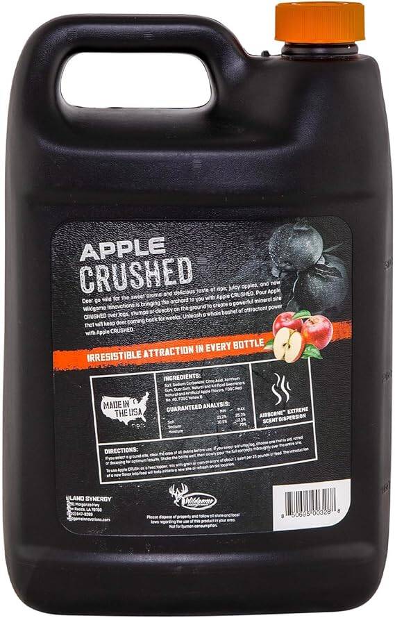 Deer go wild for the sweet aroma and delicious taste of ripe, juicy apples and now Wildgame INNOVATIONS is bringing the orchard to you with Apple CRUSH®. Pour apple Crush over logs, stumps or directly on the ground to create a powerful mineral site that will keep deer coming back for weeks. Unleash a whole bushel of attractant power with apple crush.