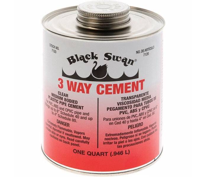 Black Swan All Purpose Cement is a clear, medium bodied, medium to fast set, high strength solvent cement used to join PVC, CPVC and ABS pipe and fittings. For all classes and schedules of pipe and fittings through 6" diameter.  All Purpose Cement is most effective when used in temperature ranges from 40° F to 100° F.