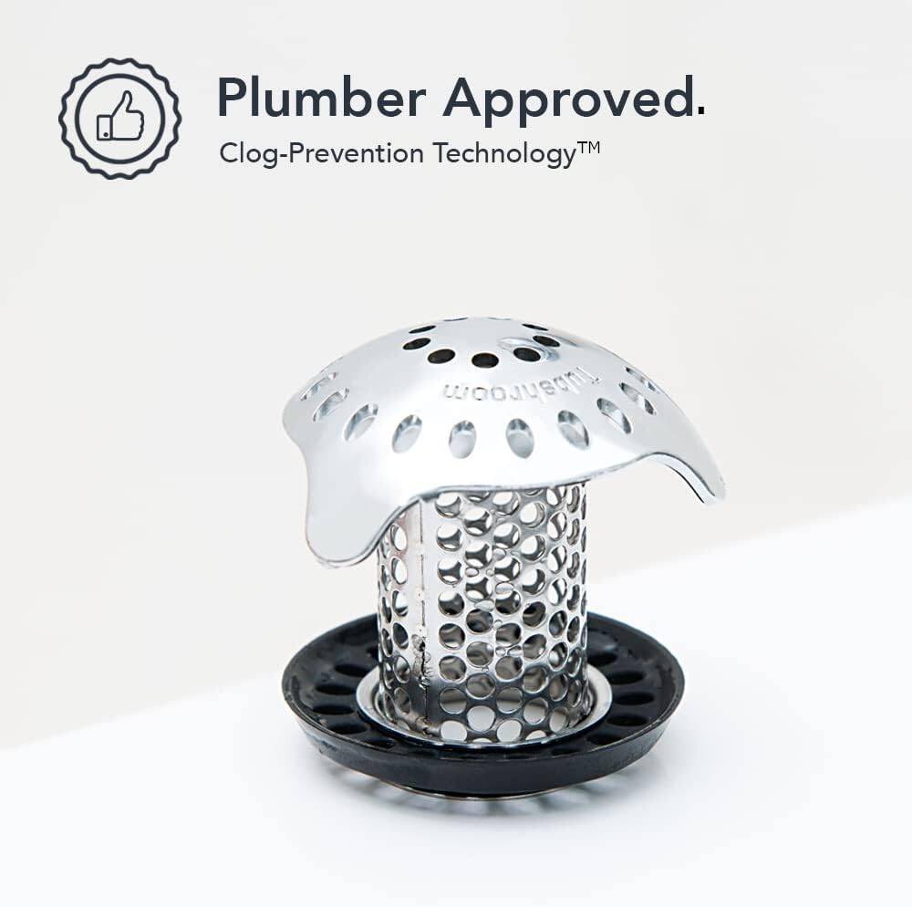 No More Clogged Drains: Our stainless steel bathtub drain strainer fits any standard tub drain and is guaranteed to catch every hair, every time. This package includes one TubShroom Ultra strainer plus one 1.5 inch to 1.75 inch adapter, one 1.25 inch adapter, and one 2 inch adapter. Save hundreds on plumber visits. A revolution in drain protection: unlike regular plugs that go over the drain, TubShroom fits inside, neatly collecting hair around it, ready to be wiped clean.