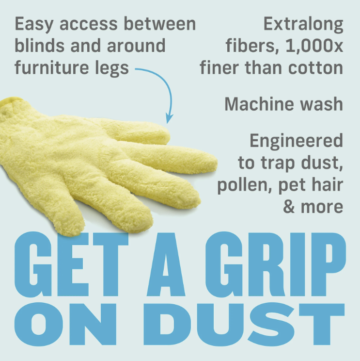 Take dusting into your own hands with the E-Cloth High Performance Dusting Glove. It picks up dust, pollen, pet hair and more from places handheld dusters can’t reach. Slip it on to clean window blinds, cabinets, furniture legs, picture frames — any surface you can get your fingers on. Extralong microfibers — 1000x finer than cotton — grab and hold dust until you rinse them out. To refresh, just toss in the laundry, because unlike throw-away dusters, our glove is guaranteed for 1 year or 100 washes. With the power to reach and clean tough nooks with the touch of your hand, you'll not only get a clean house, you might feel a bit like a superhero.