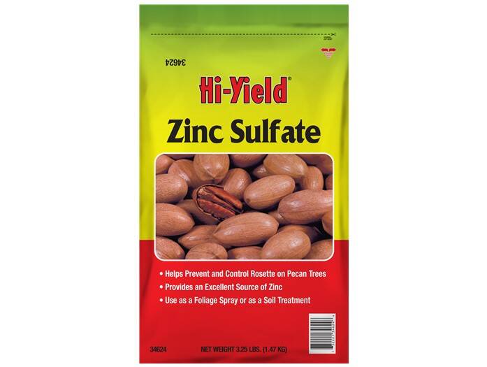 A dry formulation of zinc for application around fruit trees. Corrects deficiency that causes deformity of fruit, prevents and corrects Rosette on Pecans.
