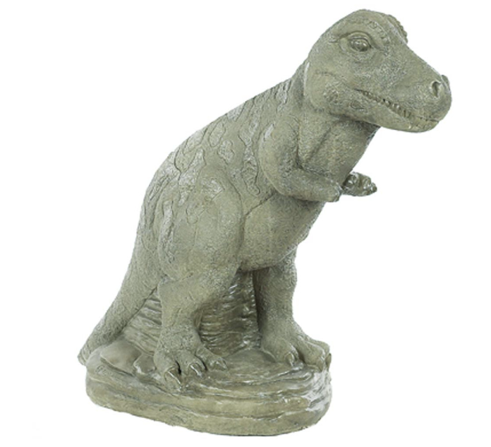 33 in H x 35 in W x 15 in D concrete dinosaur statue in walnut finish.  (Image shown in PRE AGED)