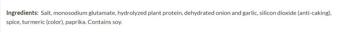 Ingredients Salt, monosodium glutamate, hydrolyzed plant protein, dehydrated onion and garlic, silicon dioxide (anti-caking), spice, turmeric (color), paprika. Contains soy
