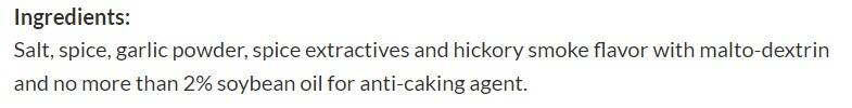 Ingredients Salt, spice, garlic powder, spice extractives and hickory smoke flavor with malto-dextrin and no more than 2% soybean oil for anti-caking agent.