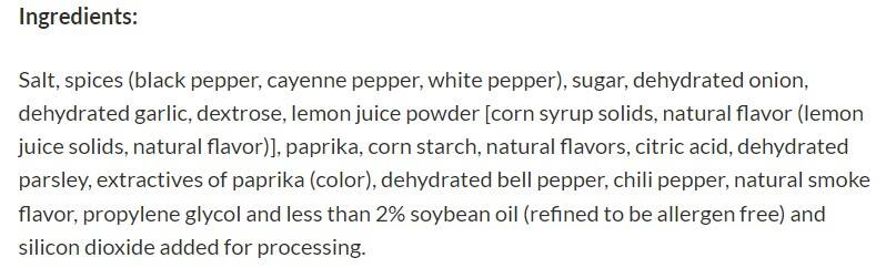Ingredients Salt, spices (black pepper, cayenne pepper, white pepper), sugar, dehydrated onion, dehydrated garlic, dextrose, lemon juice powder [corn syrup solids, natural flavor (lemon juice solids, natural flavor)], paprika, corn starch, natural flavors, citric acid, dehydrated parsley, extractives of paprika (color), dehydrated bell pepper, chili pepper, natural smoke flavor, propylene glycol and less than 2% soybean oil (refined to be allergen free) and silicon dioxide added for processing.