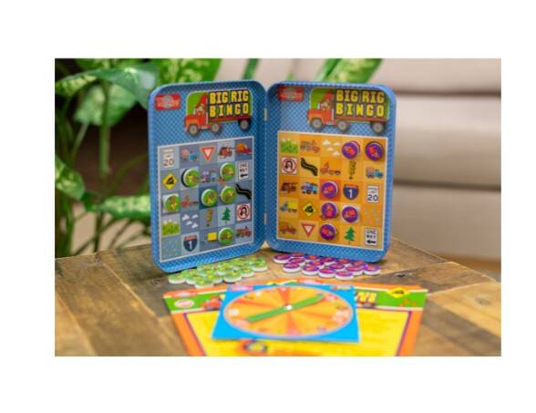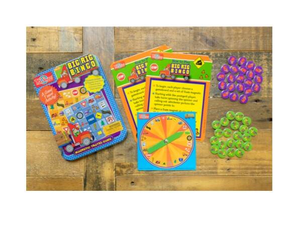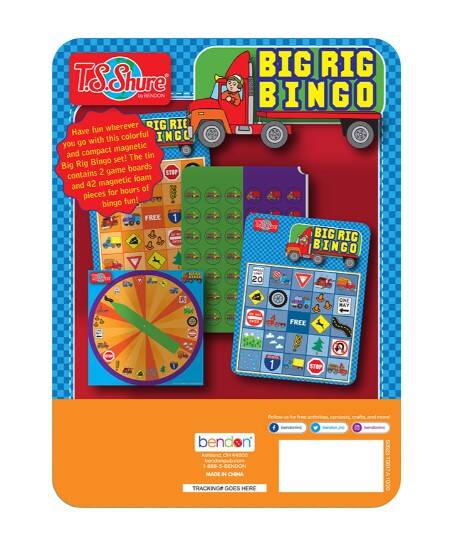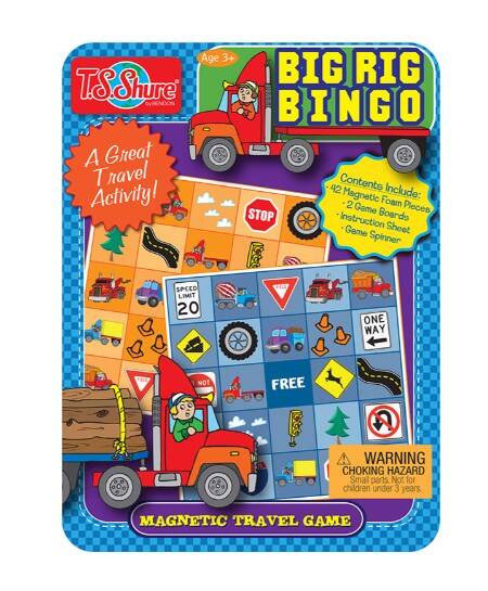 The T.S. Shure® Mini Big Rig Bingo Game Tin offers the classic game favorite in a convenient travel tin. This magnetic game tin includes illustrated bingo game boards, magnetic game pieces, a game spinner, and instructions. The entire game fits in the mini magnetic storage case for fun in the car, on the go, and at home!