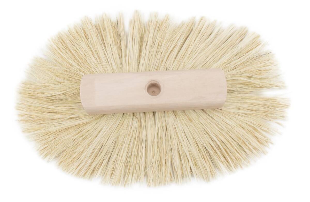 Made of 100% 4 in white Tampico hemp bristles set securely into a wooden base. Can be hand held or center-hole pole mounted.